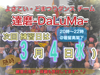 明日2/18(水)20時から 達磨-DaLuMa-よさこい練習DAY!