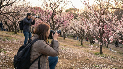 梅林の鮮やかな色彩を撮影した後は、人気の商店街へ移動。温かいカフェで休憩しつつ、情緒ある街角をスナップします。